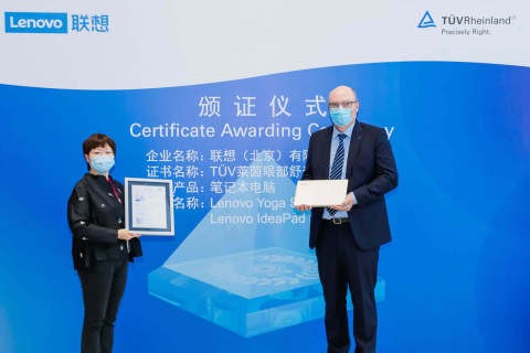 上海 -- (美国商业资讯) -- 国际独立第三方检测、检验和认证机构德国莱茵TÜV集团(以下简称“TÜV莱茵”)向联想(北京)有限公司(以下简称“联想”)Yoga S940-14IIL颁发了全球首张笔记本电脑眼部舒适度认证。联想笔记本研发产品保证与认证总监伍伟懿、TÜV莱茵上海公司执行董事陆勋海(Lutz Frankholz)、TÜV莱茵大中华区电子电气产品服务副总经理刘喜强等双方代表出席了颁证仪式。