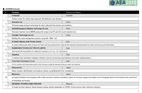 日本柏市--(美国商业资讯)--亚洲创业奖(Asian Entrepreneurship Award, AEA)指导委员会今天宣布,其将于10月27日至29日举办亚洲创业奖2020年活动(AEA 2020)。AEA自2012年推出以来已举办八届,是一项鼓励亚洲年轻企业家和科技初创企业竞相改变世界的创新奖。今年的AEA2020将完全在线进行,已连接来自亚洲13个国家和地区的30家积极进取的科技初创企业,开创了一种新的方法,反映出受疫情驱动的“新常态”工作方式。