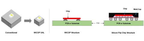 The next-generation “WICOP UHL” Series LEDs exhibit up to 40% better heat dissipation performance than other products in the current LED market. By applying WICOP UHL to automobile headlamps, the weight of lamp heat sink structure can be reduced by 75%. The LED emitting area of the product is extremely small approximately 0.5mm2, which enables a slim headlamp design. This new LED technology completely compensates for the disadvantages of heat dissipation, as the lighting emitting area is smaller, and thus it enables not only slim lamp design but also high performance.