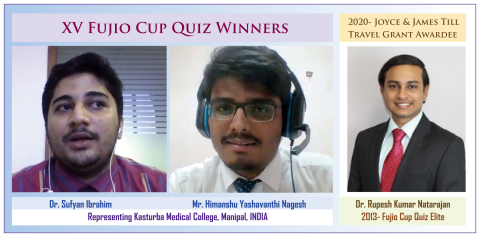 第15届Fujio Cup Quiz获胜者??来自印度Kasturba医学院的Ibrahim博士和Nagesh先生,以及2020年Joyce and James Till Travel Grant获得者Natarajan博士。(2013年FCQ精英)。(图示:美国商业资讯)